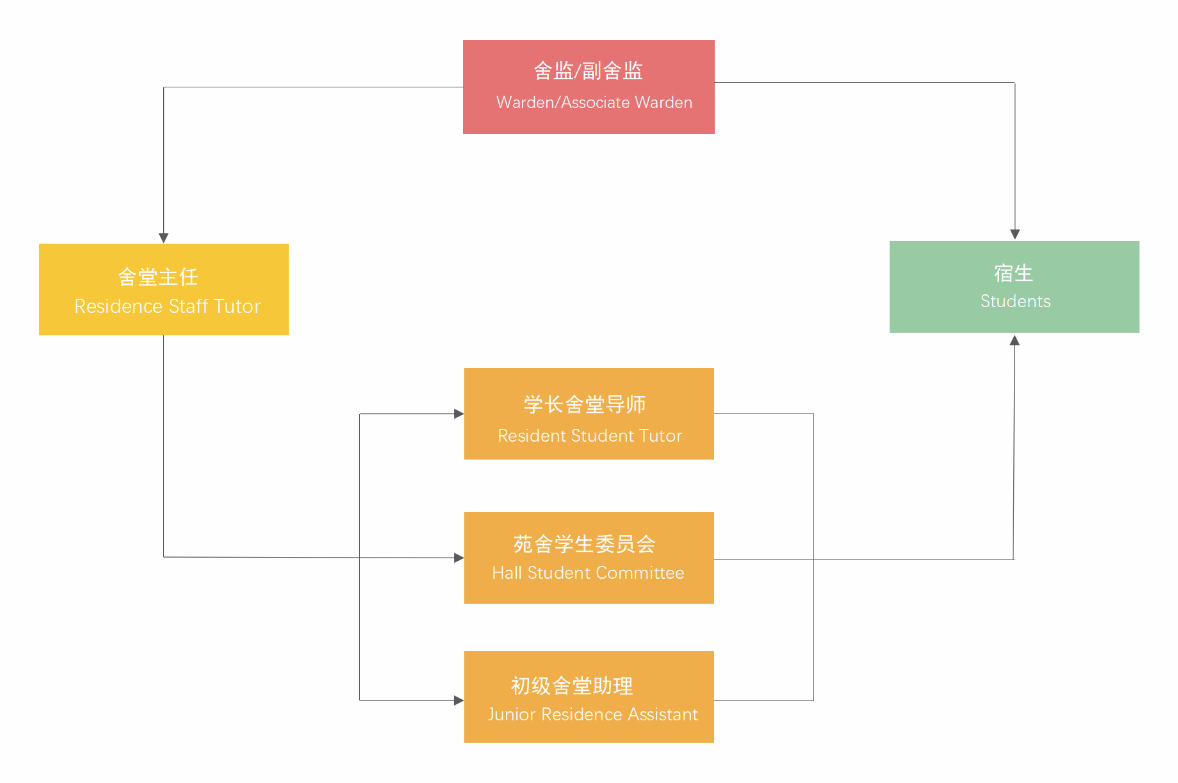 此制度的成员包括:舍监、舍堂主任、学长舍堂导师、苑舍学生委员会以及初级舍堂助理。