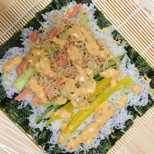 准备的有温热的米饭,寿司醋,卷帘,肉松,紫菜,萝卜条等等
