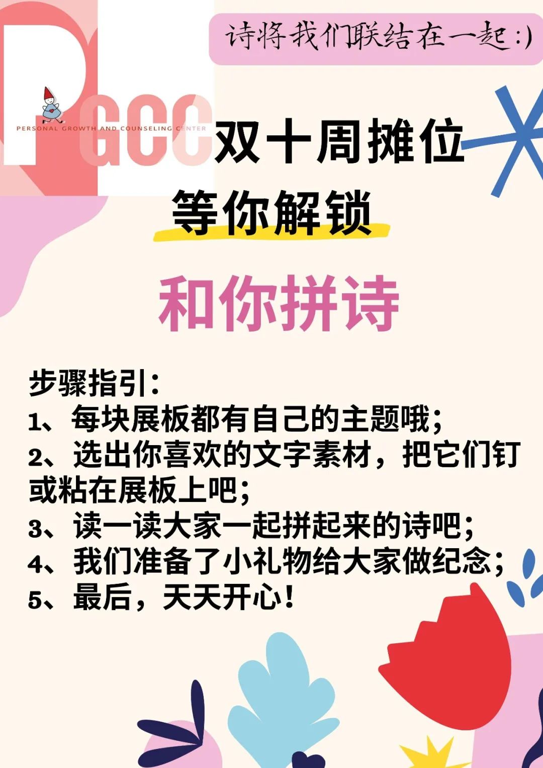 今年PGCC双十的主题为“联结”,拼贴诗组阐释了人在环境中,我们与自己、身边人、身边环境的互动组成了我们的生活事件与相应的内心体验。