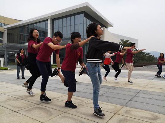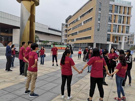 在领导力培训营开营之前,营员们要完成的任务之一是策划一个户外拓展活动,目的是来体验策划活动的过程。下午两点的中和广场,风和日丽,凉风习习。营员们便在这里带领着其他小组成员来进行他们精心准备的拓展活动。其中,E组的“独角小火车”受到营员们的一致喜爱,获得“最佳人气奖”。