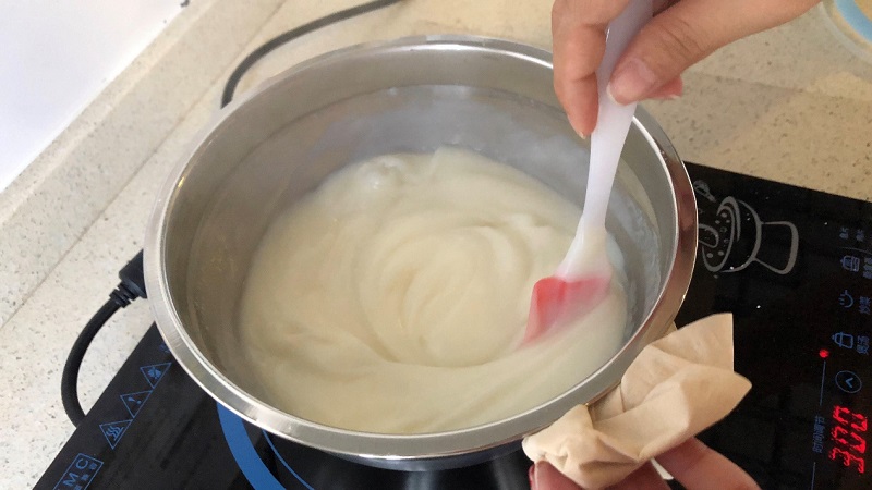 把搅拌好的混合奶液小火加热,注意把握好火候哦!