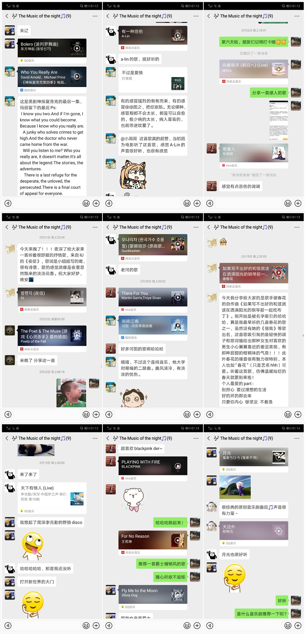 此活动形式为每天在具体的时间段内在微信群和大家一起分享自己喜欢的一首歌,同时说出你喜欢此歌的理由。在活动进行期间,同学们积极参与,每天打卡,并认真地分享自己喜欢某首歌曲的理由,理由包括了喜欢的音乐风格,听歌时的心情,以及具体的某句戳中人心的歌词 。与此同时,在听别人分享的歌曲时,同学们也会互相点评,亦或表以同意,这样既拓展了新的友谊关系,又收获了高质量的好音乐。