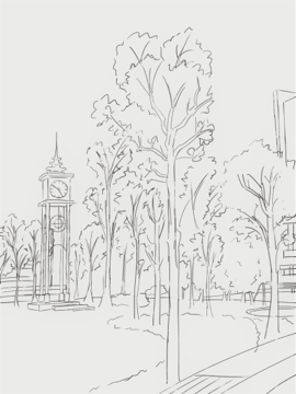 这幅画作的名字叫《钟楼》。记得它才出现在校园里的时候,我对它充满了怨念,因为每天早晨七八点,它就会准时响起,将我从甜美的梦想中唤醒,让我没有办法睡懒觉。可是后来它却成了我每天上课的指引。去教室的路上,总会抬头去看一眼时间,来判断自己应该狂奔去教室,还是可以悠闲地走过去。现在每日在家,赖在被窝不想起床的时候,就好特别想念能将我唤醒的它。(参赛者: 刘艺)