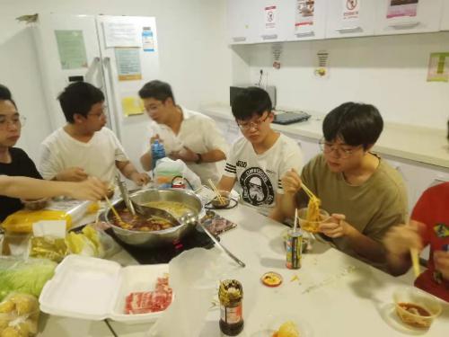 下午时分,学长舍堂导师提前来到公共空间做准备,到了晚上18:00分,同学们纷纷到来,看到在埋头忙碌的学长舍堂导师,二话不说地就撸起袖子加入“后厨大军”。随着同学们越来越多,备菜的工作很快就完成,终于开始进入正题——开吃啦!然而,在这个环节中,有过下厨经验的同学就会瞬间成为同学们关注的焦点,因为——他们可以精准判断食物涮多久才熟,而又不至于涮得过老。于是,在活动中充斥了此起彼伏的“快帮我看看这个好了没?” 、“我的可以了吗?”、“在帮我下点XXX吧?”,在这样互相帮助的过程中,同学们迅速熟络了起来,一瞬间公共空间中除了氤氲着火锅的蒸汽,还有同学们的欢声笑语。
