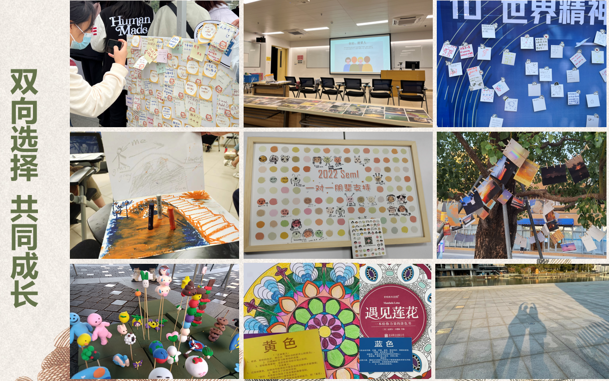 除了举办好玩有趣的大型活动外,关爱大使还会在每学期举办面向个体的一对一朋辈支持计划,通过“一对一结伴”的形式,从“身”、“心”、“我”三个方面出发,在生活分享、自我探索、人际关系和学业发展等四个方向和维度上,在理解与陪伴的宗旨下,秉持平等、尊重的态度,及同理、关怀的视角,对有需要的同学给予有效的支持和陪伴,一起在一个月的时间里共同前行。